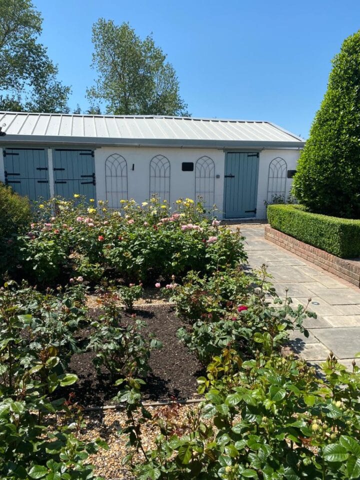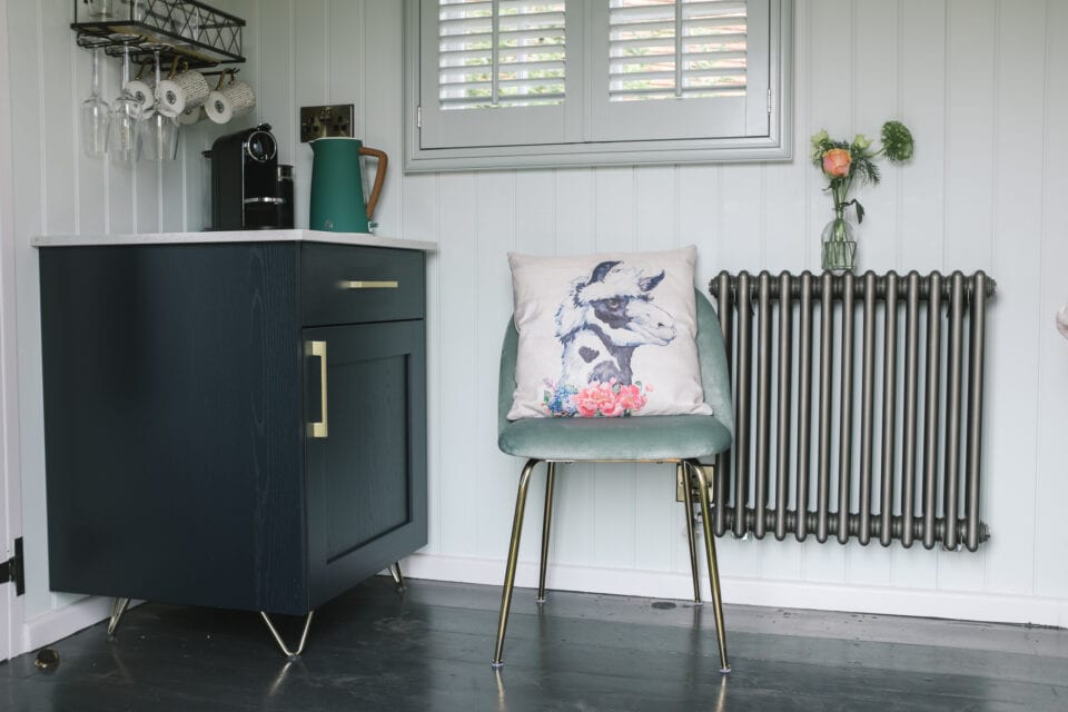 I wanted guests to get that surprise luxury feeling when they enter the shepherd’s hut, not a camping experience, our guests are going to a wedding after all! It has a fridge filled with Prosecco, Nespresso coffee machine, an iPad with Netflix, Victorian radiators, a wood burner, a bathroom with nice hot shower and an Alpaca shower curtain. My design inspiration for the paint colours came from the sea. The main colours are different shades of aquamarine (Little Greene paints). Having adopted the latest hobby of wild swimming in lockdown, I can’t get over how the sea displays different colours of blue every day I go. The gold painted woodwork, brass fitting and sumptuous velvet cushions are just a cheeky nod to the roaring 20s, which I hope we are just about to enter again.